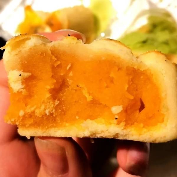 - 比起流心蛋黄酥,这个少了酥皮和流心但是奶黄馅儿很扎实,口感也不干