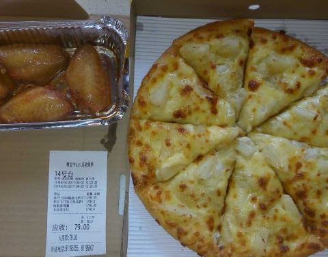 - 包含一个12寸的大披萨,一份鸡翅,一份掌中宝和三大杯茶,两大两小吃刚刚好吃光,对于孩子来说是美味大餐