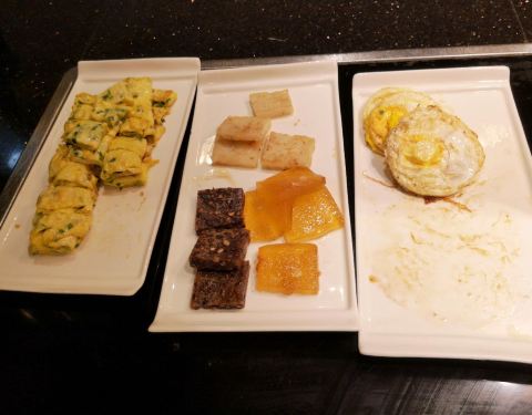 - 种类很多,煎蛋,水果,酸奶,豆浆,热菜,甜品加起来50多个种类,适合不同口味的人群,需要的话可...