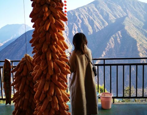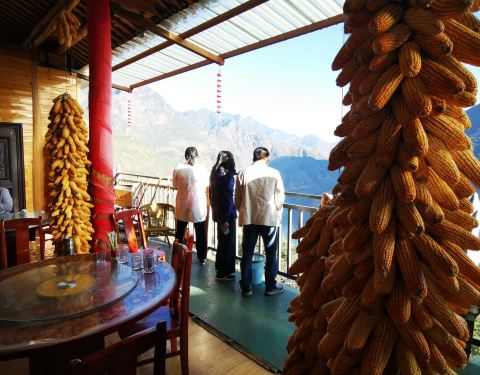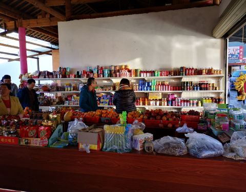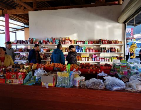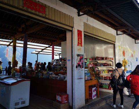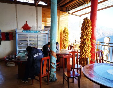 乐梅饭店是丽宁公路上的一个小饭店,位置很高很好,这里可以看到金沙江,两岸的景色很美,是个比较好的观景平台。远处可以看到金沙江上的一座桥。由于地势比较高,金沙江要俯视,两岸大山还是很雄伟的,这里是小凉山余脉。饭店供一些早餐,我们就在这里吃了面条稀饭等,中午还有炒菜的。有一个小超市,可以买一些水,食品等等。但主要是看景的。
