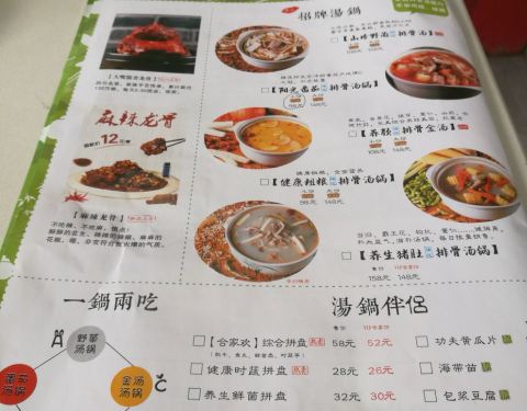 这家店以前经常路过,从来没有去吃过。这次其他网站吃货节抢了一个麻辣龙骨加蔬菜的霸王餐,正好路过就去了。以前这家在二楼,现在搬到一楼去了,而且有两个铺面。我去得有点早,不到五点,服务员有点懒懒散散。点了一个小锅的番茄排骨汤锅98元,味碟自己打,6元一个人。服务员态度还是可以,但是必须去喊。番茄排骨汤锅味道还不错,麻辣龙骨挺香的,上面有点花生很酥脆。路过可以尝尝,没有必要特别跑去。