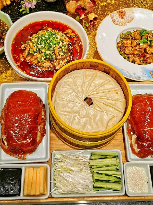 ✔️金牌四坊烤鸭 摆盘很大气的烤鸭,味道也很正宗,和我去北京吃的烤鸭味道差不多呢! 烤鸭外皮酥脆流油,里面的肉很嫩,蘸上甜面酱裹着黄瓜丝面皮一起吃,好吃到飞起!