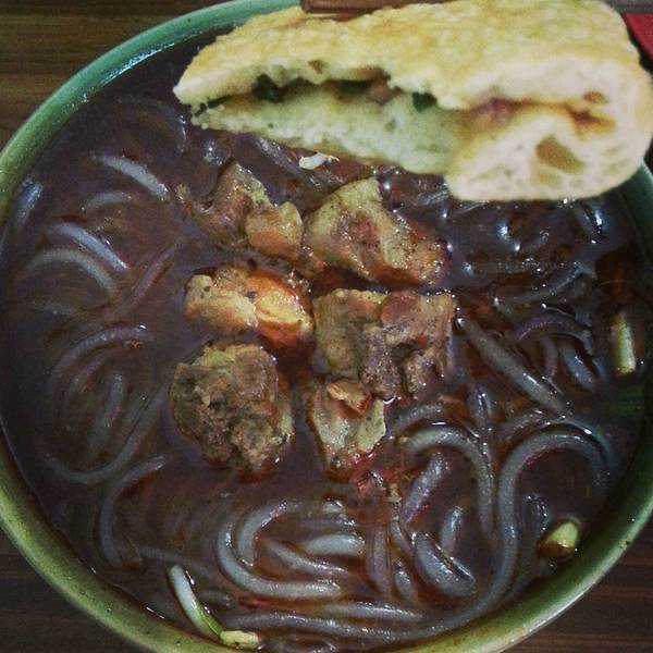 听朋友介绍,今天特意去吃了肥肠粉和锅魁。