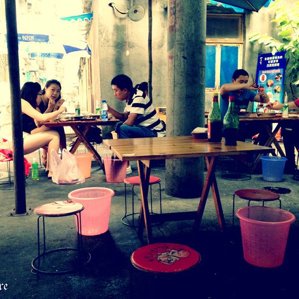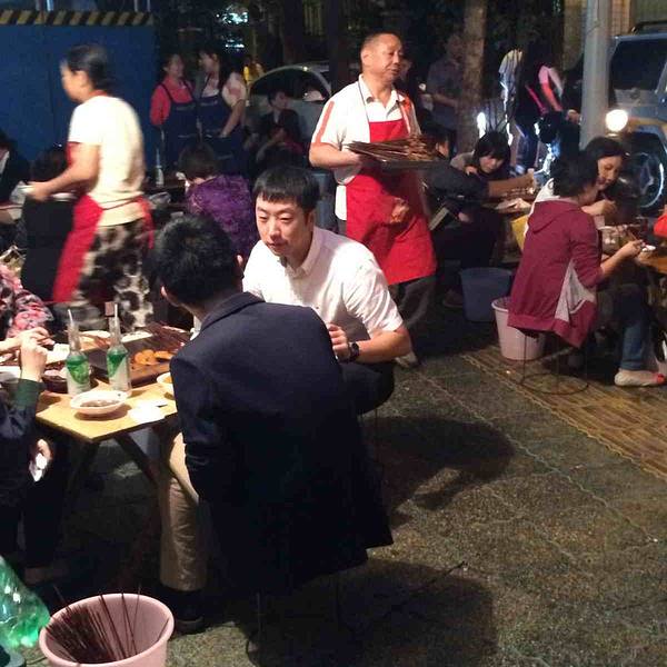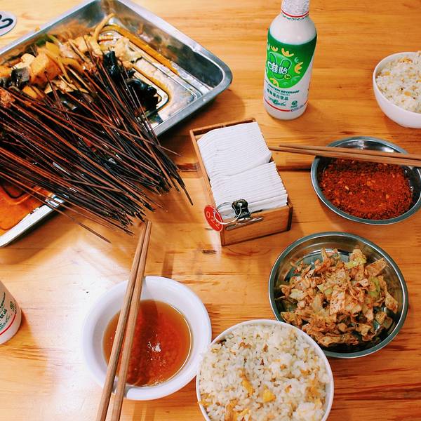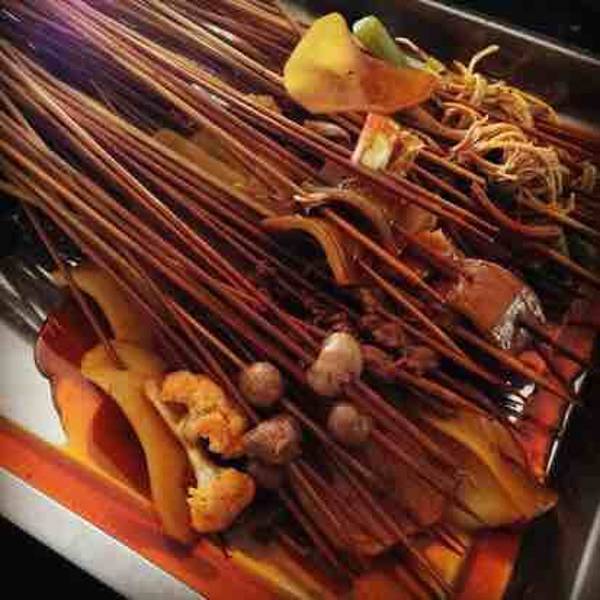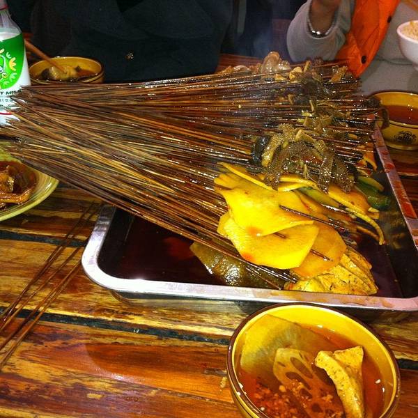 串串香十分有路边大排档的风味,店里人坐不下了,就在人行道上支上蓝色的雨棚,摆上很矮的小桌子小凳子,人就那样蜷在那儿吃,路边还有配套兜售酸梅汤冰凉粉的小铺子,真是太接地气太人间烟火了。 串串香按签子算...串串香十分有路边大排档的风味,店里人坐不下了,就在人行道上支上蓝色的雨棚,摆上很矮的小桌子小凳子,人就那样蜷在那儿吃,路边还有配套兜售酸梅汤冰凉粉的小铺子,真是太接地气太人间烟火了。 串串香按签子算,一根签子三毛钱,如果是贵点的菜,比如鹌鹑蛋啊鸡肾啊什么的,就一个鹌鹑蛋上面插上三四个签子。一般来说吃一顿几百根签子也是有的,都放在桶里,称重量算。 串串是在红油里煮好帮你端上来的。我喜欢里面的鹌鹑蛋、土豆还有像笋一样的东西。 推荐一下这家的冒脑花,会有服务员端着一托盘的脑花兜售,记得要一碗,太好吃了