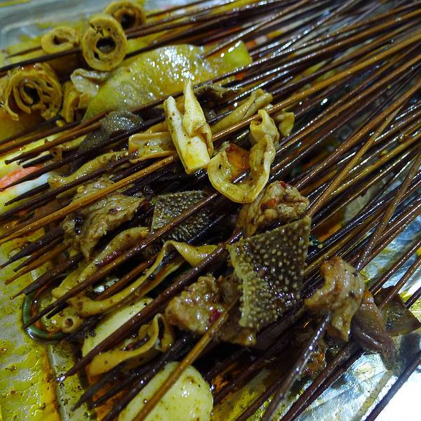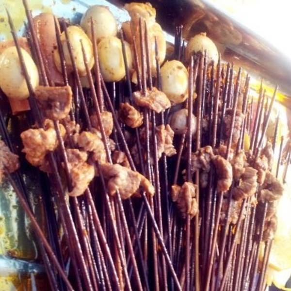串串香十分有路边大排档的风味,店里人坐不下了,就在人行道上支上蓝色的雨棚,摆上很矮的小桌子小凳子,人就那样蜷在那儿吃,路边还有配套兜售酸梅汤冰凉粉的小铺子,真是太接地气太人间烟火了。 串串香按签子算,一根签子三毛钱,如果是贵点的菜,比如鹌鹑蛋啊鸡肾啊什么的,就一个鹌鹑蛋上面插上三四个签子。一般来说吃一顿几百根签子也是有的,都放在桶里,称重量算。 串串是在红油里煮好帮你端上来的。我喜欢里面的鹌鹑蛋、土豆还有像笋一样的东西。 推荐一下这家的冒脑花,会有服务员端着一托盘的脑花兜售,记得要一碗,太好吃了
