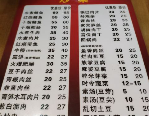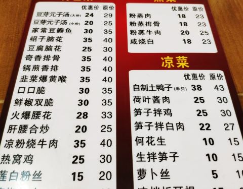 川菜 适宜家庭聚会、朋友聚餐、休闲小憩、休闲时光、随便吃吃 餐馆简介 典型的家常菜餐厅,粉蒸牛肉、豆瓣鱼的味道都不错,其他小菜的口味也过得去,价格也比较实惠、便宜。 特色服务:是老字号,有停车位,提供在线菜单,有夜宵,有送餐。