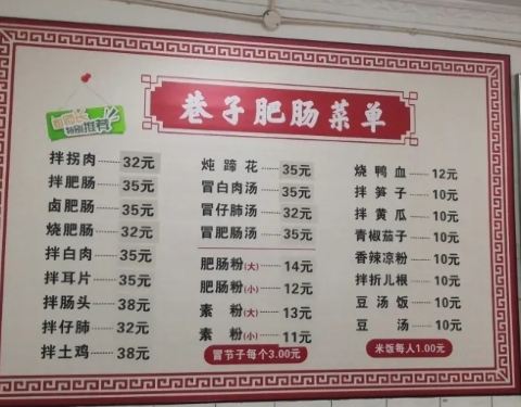 是巷子,其实还算是比较好找的一家店,招牌很大,肥肠非常出名,网上总有他们家的推荐,所以人一直很多。这里以各种做法的肥肠为主,卤肥肠、烧肥肠、拌肥肠、肥肠粉等,肥肠入味又好吃,喜欢肥肠的绝对不要错过...是巷子,其实还算是比较好找的一家店,招牌很大,肥肠非常出名,网上总有他们家的推荐,所以人一直很多。这里以各种做法的肥肠为主,卤肥肠、烧肥肠、拌肥肠、肥肠粉等,肥肠入味又好吃,喜欢肥肠的绝对不要错过。另外这里的拌拐肉和拌素菜也很不错,可以和各式肥肠一起点。 推荐菜: 茄子、 豆汤饭、 卤肥肠、 豆汤、 肥肠豆汤、 炖蹄花、 拌肥肠、 拌拐肉、 蹄花汤、 拌土鸡、 拌茄子、 拌笋子、 土豆烧肥肠、 肥肠粉、 凉拌肥肠、 烧鸭血、 凉拌拐肉、 凉拌肠头、 卤肥肠和豆汤饭、 拌肠头、 凉拐肉、 凉茄子、 拌心肺推荐给大家分享!