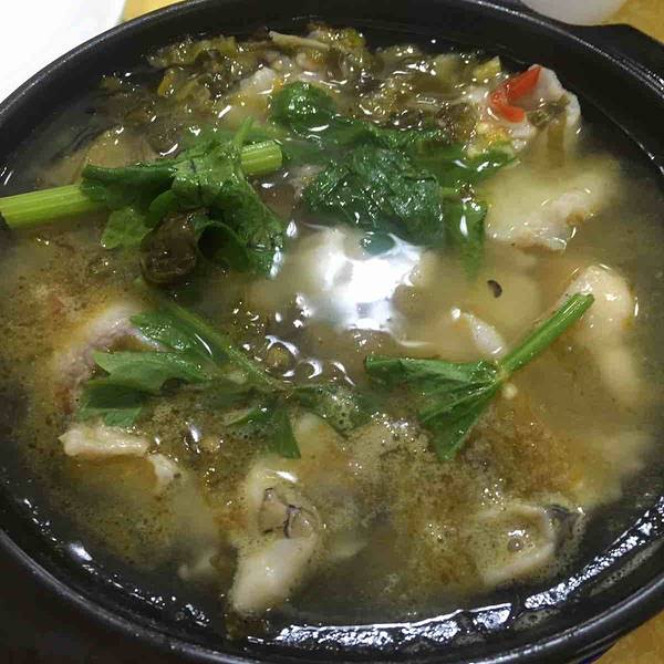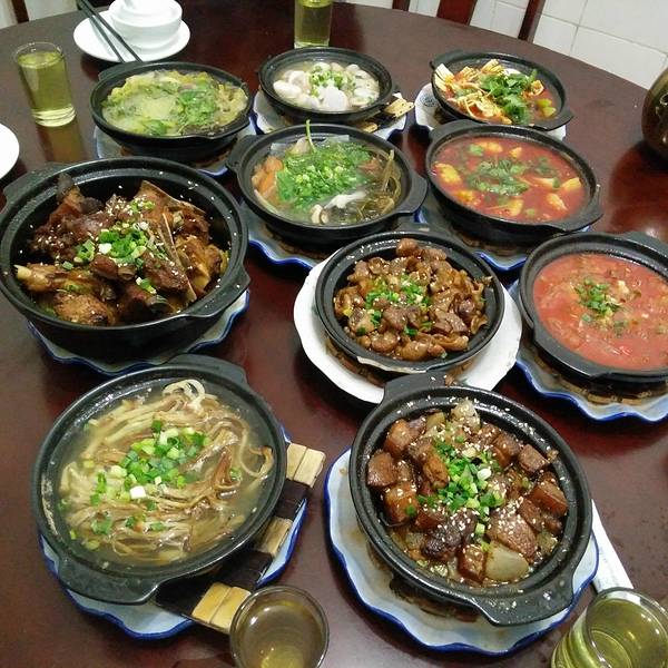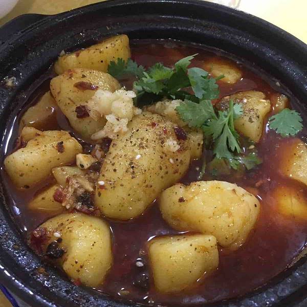朋友推荐来吃的一家店,在当地特别的出名,店铺地址就在成都郫县犀浦镇上街177号,其实这家店的地址不是很好找,可能对于本地人来说好找,但是如果对于慕名而来的外地人来说就不好找了。坐地铁坐2号线坐到终点站犀浦下,下了走路大概要走10分钟可以到,也可以坐一个三轮车几元钱几分钟就到,旁边有中国移动,还有华莱士,还有一个小医院。店铺的环境很一般,装修也特别的简单,还相对来说有点老旧,可能老字号都是这样的吧,就是白墙壁,白地砖,然后桌子整齐的摆放,餐厅一共有两层楼,一般来说都会去坐二楼,环境好一点,人少一点,这次去的时候比较晚,二楼已经关了,就坐了一楼。一进门就有服务员问你几位,坐下来之后还是很麻利的倒茶,递点餐单。点餐单就是一张简单的纸,菜名,价格上面都有,要吃什么直接勾在上面,然后递给服务员。不过这几店里的服务员倒是挺多的。点的素菜有麻辣土豆,9元一份,上来热腾腾的一份砂锅,里面装的小土豆,土豆都烧的很糯,很入味,吃到嘴里入口即化的感觉,味道稍微带了一点辣,但是完全可以接受的那种,味道还不错,主要是土豆烧的又软又入味。素芋儿,10元一份,推荐的必点菜之一,很好吃,芋头被烧的很软,完全把芋头里本来的鲜味都烧出来了,里面还有叶子菜,芋头和叶子菜烧出来的汤很好喝,很鲜,点了这个都不用再点其他汤了。荤三鲜,16元一份,不推荐,没有什么特色,就是里面有一些蘑菇,火腿肠之类的,感觉味道很普通,里面也没有多少荤菜。酸菜鱼18元一份,推荐,酸菜的味道很正宗,烧出来的鱼片也带着酸味,很入味,鱼片都比较小一片,也很薄,还是很嫩,喝酸菜鱼的汤也很不错,很酸爽,如果里面再加一点素菜或者粉丝就好了。回香猪手,22元一份,推荐的必点菜之一,猪蹄在烧锅里面烧出来颜色香艳,热腾腾的,而且一碗的份量还挺多,猪蹄烧的很入味,吃在嘴里很糯,很不错。酥肉18元一份,很一般,就是几个酥肉和几个叶子菜,味道很一般,酥肉也不怎么好吃。烂肉豌豆,15元一份,很大一份,里面都是豌豆和肉末,还有一些酸菜,豌豆也同样烧的很糯,味道一般,但是就是油比较多,吃起来比较油腻。整体来说店铺环境一般,但是也不是那种普通的苍蝇馆子一样,但是总会觉得地面和桌子都比较的油。味道还不错,特别是几个特色菜很不错,必点,价格也比较适中,人均20元一份,性价比还是比较高。
