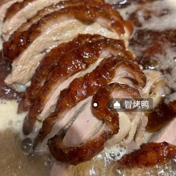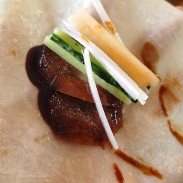 冒烤鸭和片皮鸭比起来我更喜欢片皮鸭这家包的那个面皮口感是比较好的而且每一张之间是隔开的不会一坨粘在一起总的来说好吃!!