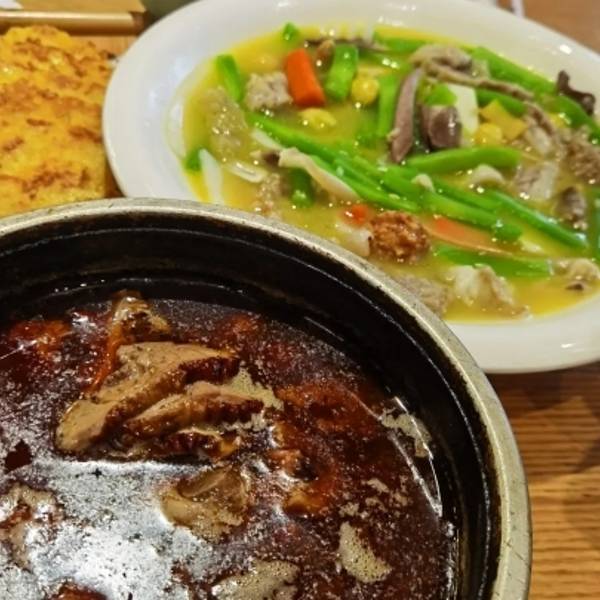 冒烤鸭鸭肉非常的香,冒菜的汁水味道也很独特。关键是一份的分量很足,我们两个人尽全力也没有吃完。 藿香鲰鱼这是一道很家常做法的菜,调料很地道,鳃鱼鲜美,新鲜藿香去腥提鲜,最后用汤汁拌饭,一不留神碳水化物就超标了百 鸭架汤挺鲜,就是冬天冷得快,服务员后来给我们加热一下,喝起来巴适。