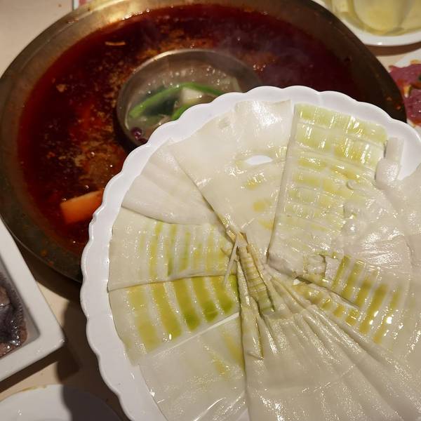 冰粉、酥肉、牛肉、千层肚、鸭肠成都火锅偏麻辣 红油锅底+香油碟啊 好吃到爆啊啊 !!!分量不少 性价比还行 比重庆火锅稍微贵一点生抠鸭肠:爽脆~珺花:嫩~珺把香菜丸子:好吃耗儿鱼:去了鱼头的一种小鱼 有骨头酥肉:果然还是这里的好吃~上海的根本不好吃红糖冰粉:甜甜的 冰冰的 吃完火锅一定要来一碗~