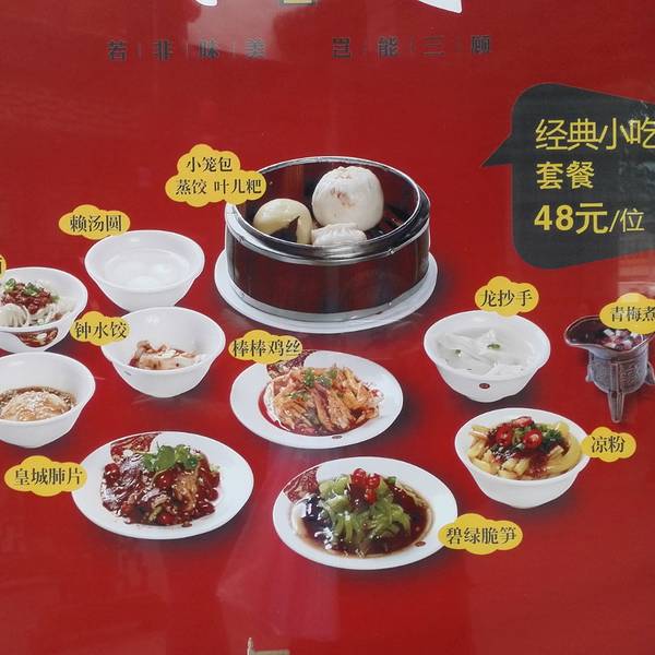 2013年的时候来锦里玩,准备走的时候才发现了这家店,觉得经典小吃套餐很值得一试,进去问了只有固定的时间才有供应,几个小时之后又有飞机,为了不误机只能作罢,每次想起来都觉得挺可惜的。直到2015年,飞去另一个地方,偶然发现,同样价位的机票有两张,一张是广州转机,停留两个小时,另一张是在成都转机,有10个小时,而且是可以出机场的那种,不假思索,毅然决然地选择了成都,而且第一反应想到要把这家店的小吃套餐补回来。 然而,这一次的时间依旧很紧急,因为这家店每天只有两个时间段可以吃到这个,刚到锦里的时候我恰好错过了第一个时间点,就又要等到下个时间了。所以强烈建议店主把时间放宽一点点吧!也提醒想要去的各位提前规划好时间啊,不然像我这样一旦错过就是两年啊。 比较不开心的一点是,一进门服务生叫我先买单在吃饭,其实对于这样的行为我特别反感,当然,快餐店除外。等我到了前台另一个服务生说我的卡刷不了,就叫我先吃在买单,于是我回到了我的作为上,但是之前的服务生又叫我去前台买单,这样反反复复的我走了三遍。我的银行卡是visa卡,虽然说不是银联,但成都好歹算是一个大城市,每年来旅游的鬼佬也挺多的,再加上锦里算是最热门的景点之一吧,怎么也不国际化一点啊。 等待上菜的时间不长不短,虽然种类的很多,不过量还是很少的。其实说,48这个价格是偏贵的,毕竟每一样单点量大也不贵,不过就是图个创意。 味道还不错,刚刚好可以把成都美食尝个遍的情况下又不撑到自己。正常人的食量应该就是吃完之后还能再来一点小零食吧。