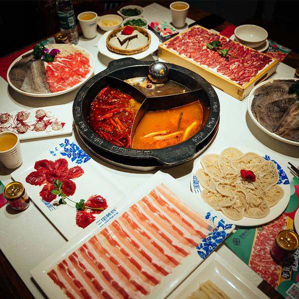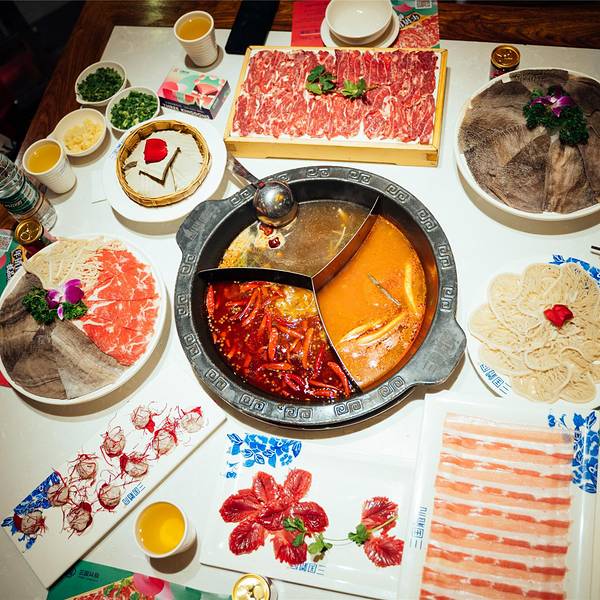 到四川基本上要天天吃火锅了,哈哈。整个店的环境上装修走的是古建风的古色古典风格,灯笼、木门、木窗以及雕刻和亭子等等古建元素在这家火锅店体现得淋漓尽致。我们排了好久的队才排到,人实在是多。点了桃园三结义锅,菌汤+番茄+辣锅,告别选择恐惧症!「精品鲜毛肚」毛肚很大片,新鲜也比较嫩,十秒足以。「现切极品牛肉」端上来好大一盘鲜切牛肉,牛肉的质量特别的好,既有瘦肉,也有脂肪,切的很薄很大一片,口感很嫩而紧致。「鲜郡花」摆的好看不说,量也很足,四个人吃到傻掉。「精品千层肚,很脆很新鲜,千层肚下锅式秒即熟,七上八下起起伏伏,在筷子挥舞之后,千层肚沁入诱人的红汤,顶着热辣入口,脆嫩弹牙,这般滋味爽。「功夫土豆片」第一次看到土豆片可以摆盘的如此美观,也算是一种艺术了。「上上签」名字起得很好,味道也不错。其他的配菜味道也是不错的。我们在火锅店一直坐到下午三点,因为下午一点和晚上七点钟都有川剧和变脸的表演,没见过现场表演变脸的我们也是惊呆了。