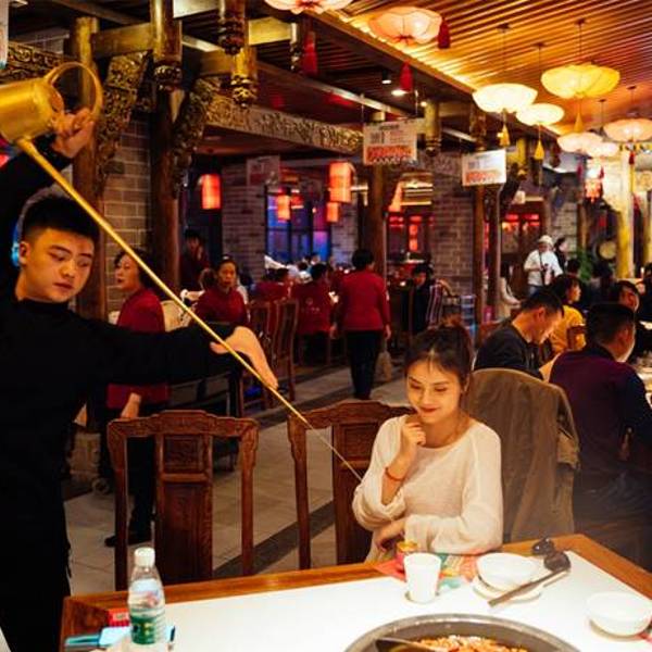 我们去的是离锦里特别近的总店,仿古建筑显得尤为气派,上下两层,场地也很大,门店装潢显得很古色古香,顾客很多显得极为热闹,就餐环境也很令人享受。在楼下都可以被这个气派的门店震慑到,红红灯笼高高挂,营造出了一个精致又大气的饭店形象。其包房的名字都是重庆特色,六点半就开始有演艺了,川剧,变脸,舞蹈这些有成都特色的表演都有,我在别的地方吃的火锅要不太辣的也还是超辣,但是这里要不太辣的锅底真的就不太辣。