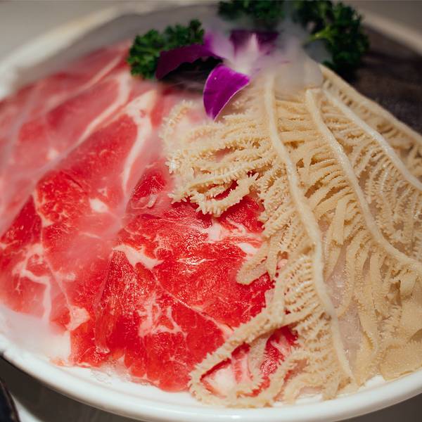 「桃园三结义锅」有菌菇、番茄、牛油三种口味,照顾了大家多样化的选择,牛油锅底,很香很浓;番茄汤底酸甜,酸的味道非常刺激食欲;吃了很多油腻的还是最适合喝菌菇汤了,泛白浓郁,香气很浓。饭后一碗菌汤和番茄汤,大满足。「自制黑豆腐」黑豆腐放在辣汤里面越煮越好吃,必点。建议烫两分钟「鸭郡花」刀工与美食的完美结合,烫完吃下去慢慢都是肉的满足感,建议两分钟哦。「手工虾滑」火锅的必点单品之一!虾滑鲜嫩脆滑,这家的特别赞,女生们一定要试试看,口感超Q,外面裹着新鲜玫瑰花瓣,而且管煮多久,花瓣都不掉,整个迸发出少女心。我已经很饱了,但是再来一盘虾滑我还是可以吃光光。【现切极品牛肉】这道菜品是他们家现在热推的一道牛肉,介绍说是采取牛肉最精细部位,每头牛才能切下六片而已。满满一层现切雪花牛肉,涮烫后,鲜嫩无比。每天限量供应的,品质很高。摆盘非常好看。牛肉色泽非常好看,光看着就能想象到下锅烫完的口感了。建议25S【极品雪花牛肉】雪花牛肉即指脂肪沉积到肌肉纤维之间,形成明显的红、白相间,状似大理石花纹的牛肉,营养价值比起普通牛肉来说要高不少。雪花牛肉真的号称有百变的口感,他们家的必点菜,大口吃肉才够爽,建议30S【桃园三结义】雪花肥牛+毛肚+千层肚,都超级好吃,各取所爱吧,一盘里面集齐三样,真的解决选择困难症患者的问题。总体是五星推荐,很有成都特色味道的火锅儿~环境不错,非常适合招待客人。
