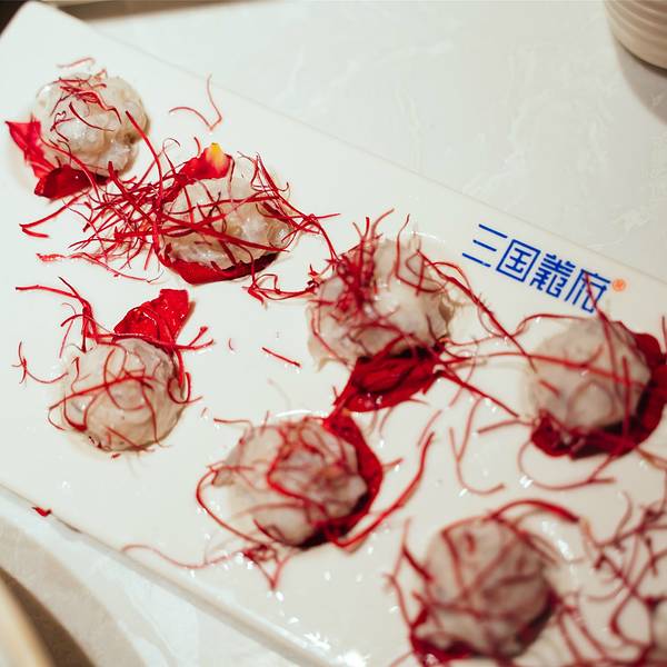 古蜀之民,擅狩猎,好烹饪,庖厨何氏,善铜鼎燎食(火锅之术),其子嗣承其技法,世代相传。他们家号称是将三国情义文化与成都休闲生活优质融合。独创“火锅十诀”。非常有趣。有名言:如果当年有这口锅,东汉就不会分三国。有意思! 他们家有三家门店,分别在武侯祠、科华北路和北门大桥。【环境、服务】 我们去的是离锦里特别近的总店,仿古建筑显得尤为气派,上下两层,场地也很大,门店装潢显得很古色古香,顾客很多显得极为热闹,就餐环境也很令人享受。在楼下都可以被这个气派的门店震慑到,红红灯笼高高挂,营造出了一个精致又大气的饭店形象。其包房的名字都是重庆特色,六点半就开始有演艺了,川剧,变脸,舞蹈这些有成都特色的表演都有,我在别的地方吃的火锅要不太辣的也还是超辣,但是这里要不太辣的锅底真的就不太辣。 服务员态度都超级好。 【菜品】 「桃园三结义锅」有菌菇、番茄、牛油三种口味,照顾了大家多样化的选择,牛油锅底,很香很浓;番茄汤底酸甜,酸的味道非常刺激食欲;吃了很多油腻的还是最适合喝菌菇汤了,泛白浓郁,香气很浓。饭后一碗菌汤和番茄汤,大满足。「自制黑豆腐」黑豆腐放在辣汤里面越煮越好吃,必点。建议烫两分钟「鸭郡花」刀工与美食的完美结合,烫完吃下去慢慢都是肉的满足感,建议两分钟哦。「手工虾滑」火锅的必点单品之一!虾滑鲜嫩脆滑,这家的特别赞,女生们一定要试试看,口感超Q,外面裹着新鲜玫瑰花瓣,而且管煮多久,花瓣都不掉,整个迸发出少女心。我已经很饱了,但是再来一盘虾滑我还是可以吃光光。【现切极品牛肉】这道菜品是他们家现在热推的一道牛肉,介绍说是采取牛肉最精细部位,每头牛才能切下六片而已。满满一层现切雪花牛肉,涮烫后,鲜嫩无比。每天限量供应的,品质很高。摆盘非常好看。牛肉色泽非常好看,光看着就能想象到下锅烫完的口感了。建议25S【极品雪花牛肉】雪花牛肉即指脂肪沉积到肌肉纤维之间,形成明显的红、白相间,状似大理石花纹的牛肉,营养价值比起普通牛肉来说要高不少。雪花牛肉真的号称有百变的口感,他们家的必点菜,大口吃肉才够爽,建议30S【桃园三结义】雪花肥牛+毛肚+千层肚,都超级好吃,各取所爱吧,一盘里面集齐三样,真的解决选择困难症患者的问题。总体是五星推荐,很有成都特色味道的火锅儿~环境不错,非常适合招待客人。