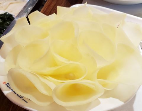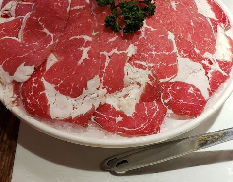 ...上来好大一盘鲜切牛肉,牛肉的质量特别的好,既有瘦肉,也有脂肪,切的很薄很大一片,口感很嫩而紧致