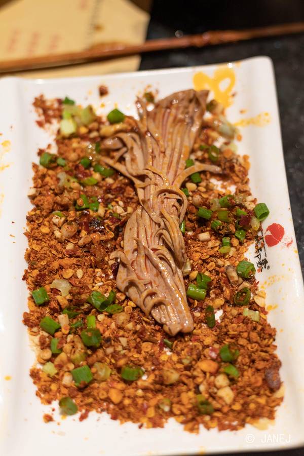 锦城印象火锅的九尺鹅肠超夸张——先上一挂完整的鹅肠,长到服务员必须一人端着盘子蹲下,另一人把手臂举得高高的,才能延展出鹅肠的长度,引得我们好奇观望,纷纷掏出手机相机开始拍摄,周围食客看我们这阵势以...锦城印象火锅的九尺鹅肠超夸张——先上一挂完整的鹅肠,长到服务员必须一人端着盘子蹲下,另一人把手臂举得高高的,才能延展出鹅肠的长度,引得我们好奇观望,纷纷掏出手机相机开始拍摄,周围食客看我们这阵势以为是看什么表演吧,也转头过来看热闹。虾滑连摆盘都是爱你的形状~口感很好,鲜香弹牙。牛肉好吃!一点都不塞牙,非常嫩,肉香味十足,正在箍牙的我很怕吃纤维多的肉类因为容易塞牙,但是吃这个牛肉完全没问题,这一点让我甚是欣慰。腰花也是一大特色,一般火锅店里上的是腰片,猪腰切成薄薄的一片,但这家把猪腰切成较厚的一片,并划上菱格改刀,腰花在高温的汤锅里涮煮,划成菱格的一面很快就被烫得卷起来,像一个松果。服务员邓姐专门拿两个干海椒面儿蘸碟过来,告诉我们腰花用干碟更好吃……邓姐说的对,腰花卷起的地方势必裹进更多的香油,吃起来容易油腻且会掩盖腰花细微的香味,而少量的干辣椒面香酥干爽,丝毫不会抢腰花的风头,并且辛辣也能恰到好处的去腥味,只留下腰花的醇厚细嫩。每次吃火锅必点红糖糍粑,不过这家的不是特别符合我心意,可能是因为糍粑炸得不够焦吧,强烈推荐蜀九香的红糖糍粑,吃了不会后悔。除了菜品新鲜丰富,味道很好之外,我对锦城印象的好感有40%来自于服务,专门负责我们桌区域的邓姐,眼明手快,不停帮我们上菜撤盘,控制烫菜的速度和火候,但又并不会打扰我们用餐和交谈,礼貌而有分寸,让我们吃得很舒服,贴心服务润物细无声(给邓姐鼓个掌!)