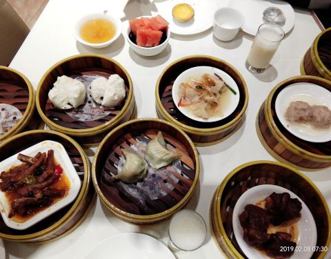 2019年春节成都之行( ̄y▽ ̄)~*捂嘴偷笑 在成都的吃吃喝喝玩玩的日子里,真是幸福,好怀念哦⊙∀⊙!这是吃的一次自助早茶,从高新区悠方骑共享单车一早到达,嘛呀,好远哦,导航不准[阴险][阴险] 七点多到达,已经有就餐的了,但还是有很多空位,找个离着餐台近的,方便,哈哈 喜欢凤爪,特别好,脱骨,我好像吃了三盘[胜利] 奶黄包是要到窗口单独领的,吃完一盘就可以去要,夹心给力,吃一个基本顶住啦[笑哭] 小猪蹄子,我喜欢,Q弹的肉肉,粘嘴,这胶原蛋白补得来。 毛肚,一小盘分量那么多,味道棒棒哒,没敢多吃,不好消化。 原本以为早茶的自助应该能吃很多,非也,也是眼睛不饱肚子装不下的节奏,唉,如果青岛有这品质的早茶自助就好了。 服务员们可能因为起太早的缘故,都不玩不热的。