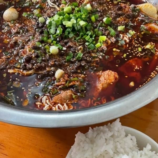 接地气!到的早基本没排队。点菜旁边有个巷子有座位。 一个人,老板娘让我点一人份的冒素菜,是很明智的。量真的巨大。选了最不辣的那种。