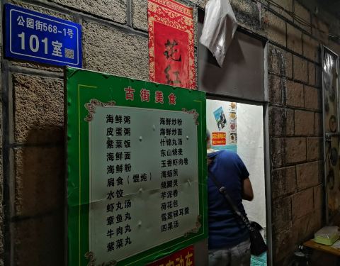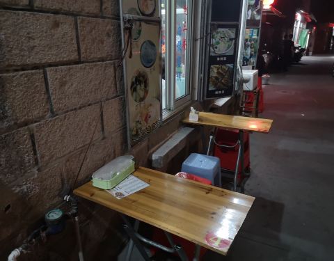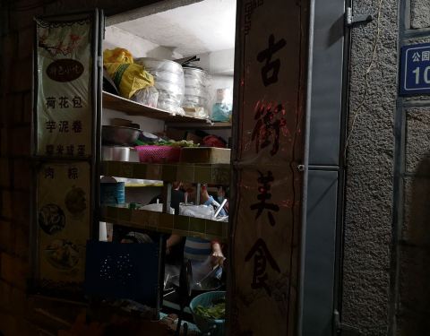 古街美食,顾名思义,就是在铜陵古街里面的,走到一半就会看见的小店铺这边主要是家庭式的做法,在这里上面好像是他们家居住的,楼下这里就是大家吃饭的地方,有两张桌子是在店铺外面。
