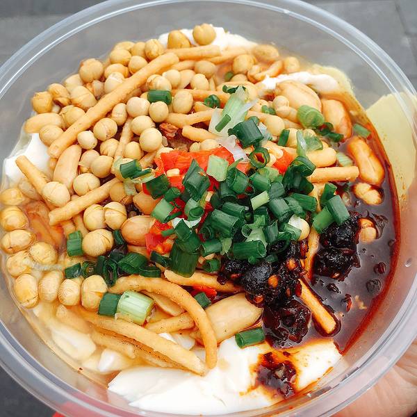 成都的豆花和我们湖南人平常吃的豆花都不是一回事,这是一碗料很足的豆花。豆花占一半,撒子占一半。豆花上撒了脆黄豆、老干妈、花生、葡萄干、辣酱、白糖、白糖根等等,很有特色。只能说成都人会吃,讲究!
