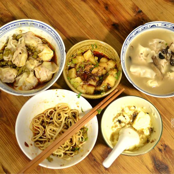 以配面的哨子配抄手,馅儿都是鲜肉口菇的,红油抄手入味儿深,吃起来很带劲,豇豆抄手很美味,泡过的豇豆炒上肉臊子,配上红油、香葱等干拌吃,很多人都爱。把每种味道的抄手都吃了一遍