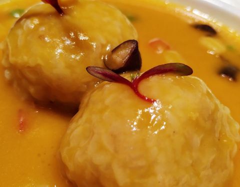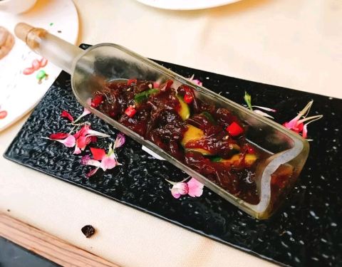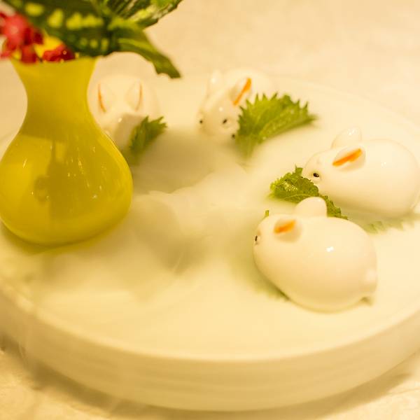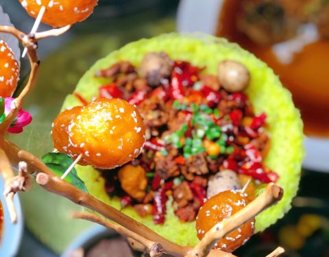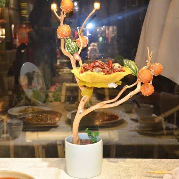 一个镶嵌有川剧人物的大圆盘,感觉这不单是一种美食也是一种文化,放着两碟牙签牛肉,牛肉微带麻辣,咸淡适中干而不硬,在川剧人物的映衬下凸显的 四川 特色真让人拍手叫绝。传统鸡豆花:吃起来入口即化,非常细腻,喝点汤吃点豆花味道比较清淡,鸡汤味的挺鲜还不错。糖油果子 四川 地道的街头小吃代表,摆盘真的是花了不少心思,当真是巨作,树形摆盘,将糖油果子放置其树枝上,似乎真是结出来的果实,趁热吃味道极好。【月上玉兔】