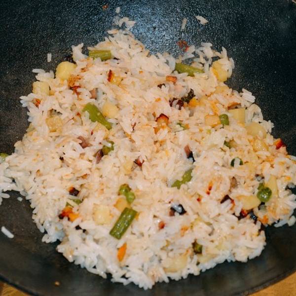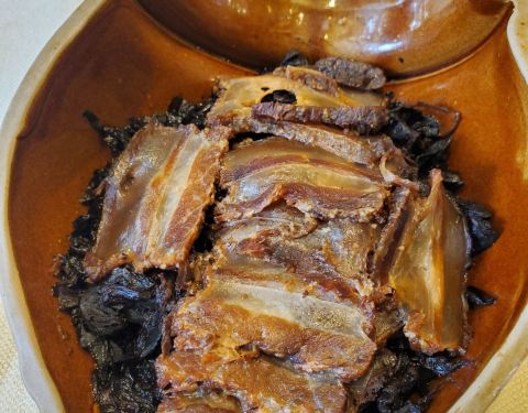 腊肉,四季豆,胡萝卜等切成丁状,混合着豌豆置于锅底,将没有完全熟的米饭覆盖在上面,盖上盖子加火?焖煮10-15分钟,揭开盖子那一刹那喷香四溢,饭香菜香融为一体,不禁回忆起儿时的柴火记忆。这时候再用脆皮鸡下饭,感觉我一个人就能吃掉这一锅的饭。【家常牛脊髓】