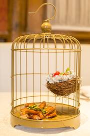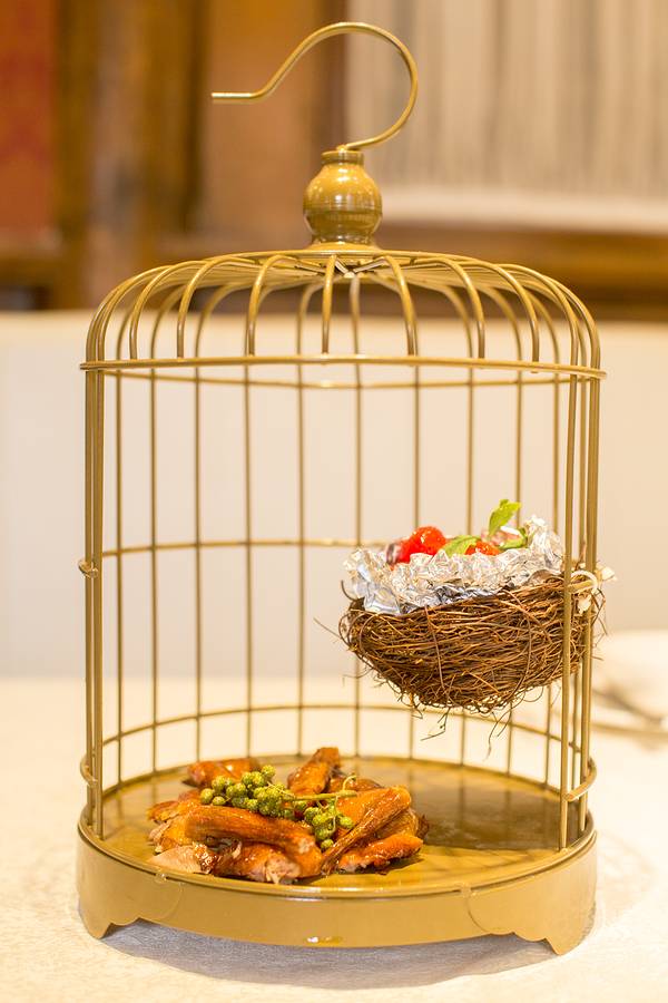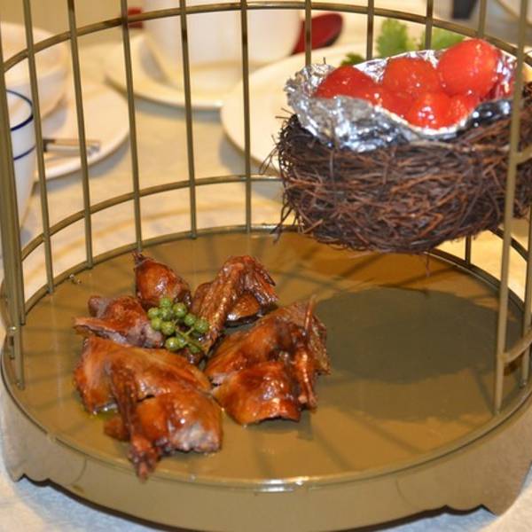 香积厨1999(宽窄巷子店) 宽巷子18号(近地铁宽窄巷子站B口) 人均:80元 【环境】一楼老茶楼既视感,二楼是包厢。地处宽窄巷子,老成都文化底蕴浓郁。 【菜品】网红餐厅体验感强烈,装盘大气有记忆点,味道麻辣适中。 #金牌蒜香鱼# 整条的外皮都炸至金黄酥脆,内部鱼刺偏少,蘸上酱料,入口很是舒畅。 #脆皮乳鸽# 乳鸽的装盘让人记忆颇深,一个鸟笼,笼中有鸟窝,窝中有小番茄,笼里则是脆皮乳鸽。乳鸽烤至金黄,色泽鲜艳,极具食欲。金黄色又与红色相互辉映,使大家的食欲得到了提升。 #狮子头# 优选五花肉做成小拳拳大小的肉丸子,可清蒸或红烧。狮子头色泽金黄,搭配两只幼苗,如春天种子发芽的盛景。入口肥而不腻,食欲感颇为强烈。 #网红兔兔# 兔是一道甜品,外形是酸奶制作而成的兔兔模型,内层有些像荷包蛋,里面包含着微甜的芝士。兔兔很柔弱,一不小心就夹断了,食用时请温柔对待。 老成都的文化在宽窄巷子,宽窄巷子也不乏川菜的底蕴。