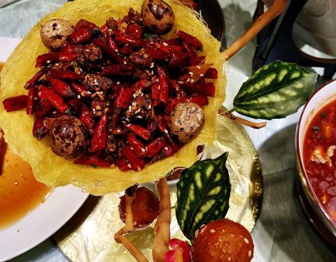 麻辣鲜香 锅里的芋头真的很好吃,比起本地芋头更爽滑 蛙肉也很嫩 「硕果累累辣子鸡」 造型有意思...