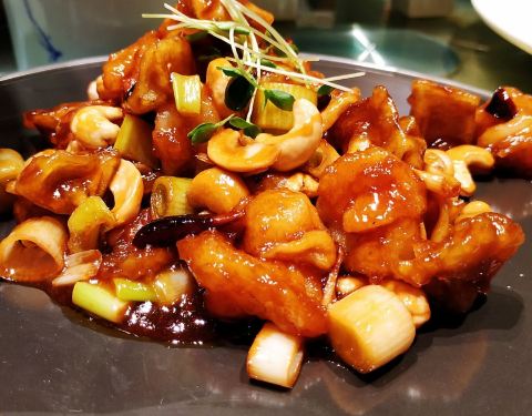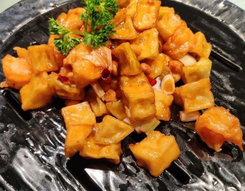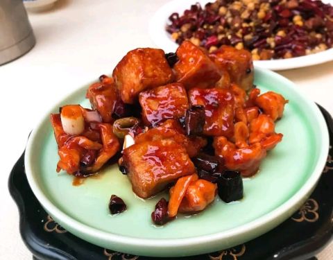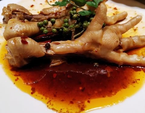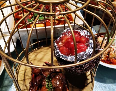 我猜这是从宫保鸡丁延伸出来的菜式吗,端上桌的的时候仙气飘飘,配菜和虾仁都还不错,虾仁口感滑嫩Q弾可口,酸甜的复合口味型也很适合外地朋友吃。【花椒脆皮乳鸽】【麻辣鸡爪】