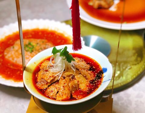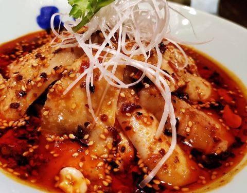川菜的经典菜凉拌系列,红油上漂浮着芝麻,看起来色香味俱全,吃起来特别香,腰片厚薄适中十分入味,下面有垫一层豆芽别忘了尝一尝。【老成都红油脆皮鸡】