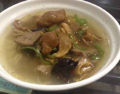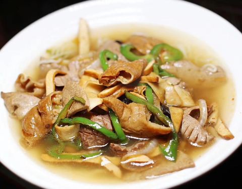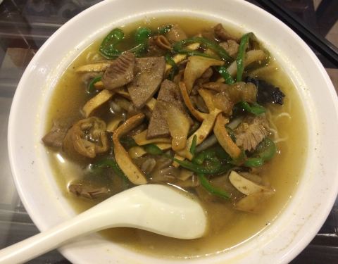 牛杂、猪杂经过卤制后再加青椒单锅炒制,最后盖浇在煮好的面条上,很偏僻的小巷子里面,一般不好找
