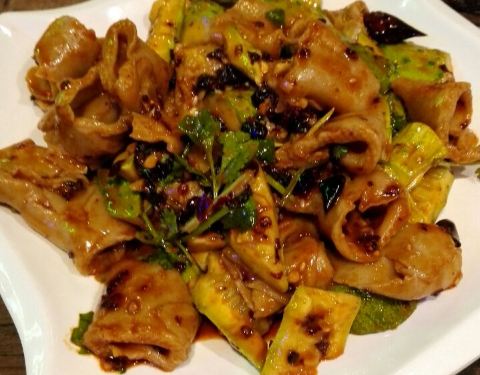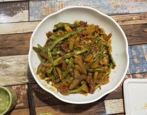 特色的豆角焖面,很好吃,要了半份儿也好大一份,一个人也吃不完,吃的很饱。环境也不错。还点了一个猪肉冻,沾上蒜汁,也很好吃。