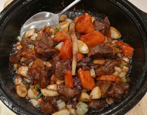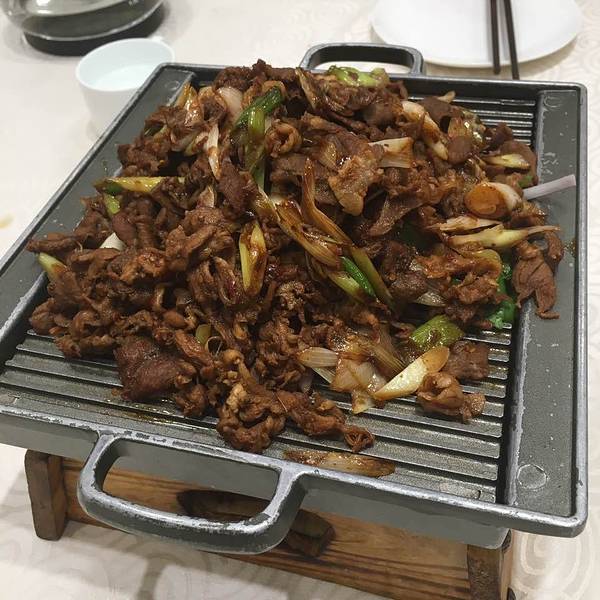 - 大葱和牛肉在铁盘子上烤,半烤半炒的感觉,很入味,重口。烤好的肉配米饭配大饼吃都好吃