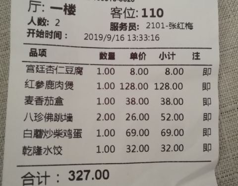 来之前看了好多美食攻略,无一不提及新乾隆酒楼,正好酒店就在旁边,放下行李立刻来品尝,总体感觉——咸~~ 作为口重的地道东北人,能让我觉的咸的是真的咸。之前看网上评论很多人都说菜咸,还觉得是不是有点夸张...来之前看了好多美食攻略,无一不提及新乾隆酒楼,正好酒店就在旁边,放下行李立刻来品尝,总体感觉——咸~~ 作为口重的地道东北人,能让我觉的咸的是真的咸。之前看网上评论很多人都说菜咸,还觉得是不是有点夸张,亲身体验后才发现是真的很实事求是,几个菜吃下来,只记得杏仁豆腐点的清爽好吃。 红参鹿肉煲咸、白蘑炒柴鸡蛋咸、八珍佛跳墙(素)齁咸~~本来吃了几个咸的菜,想来盅滋补汤清清口,结果更咸。麦香茄盒不咸了,但是齁甜~~相比较乾隆饺子算正常了,不过因为是后上的,我也不知道是咸过劲了感觉不出来,还是本来就算清淡。值得一提的是配饺子的蒜很好吃,有点像糖蒜也有点像腊八蒜,总之很不错。 虽然调味上有些遗憾,但菜品、做法还是很有地方特色的,酒楼的服务也尤其好,服务员很热情主动,服务意识很好。 总之,作为特色新乾隆还是值得体验的,只是在点菜后服务员问忌口时记得提醒:“请做的稍微清淡点,少放盐,谢谢!”