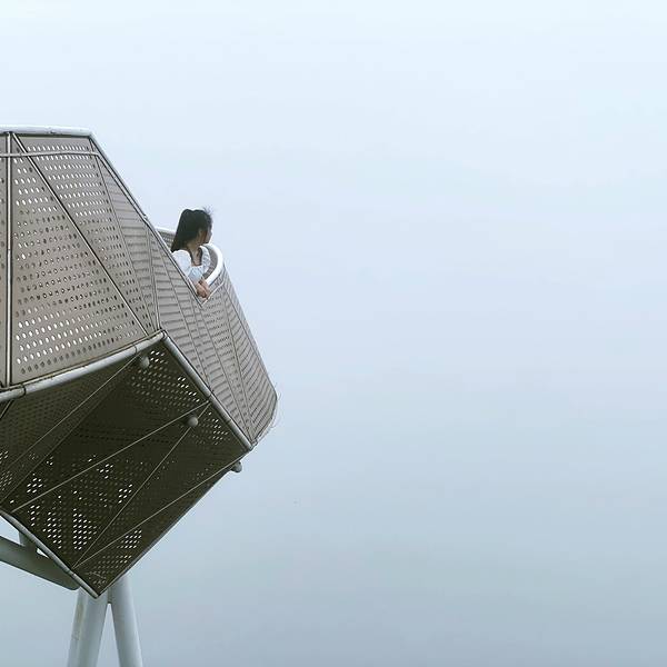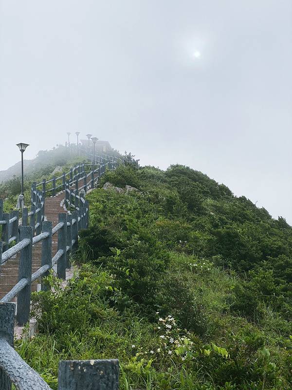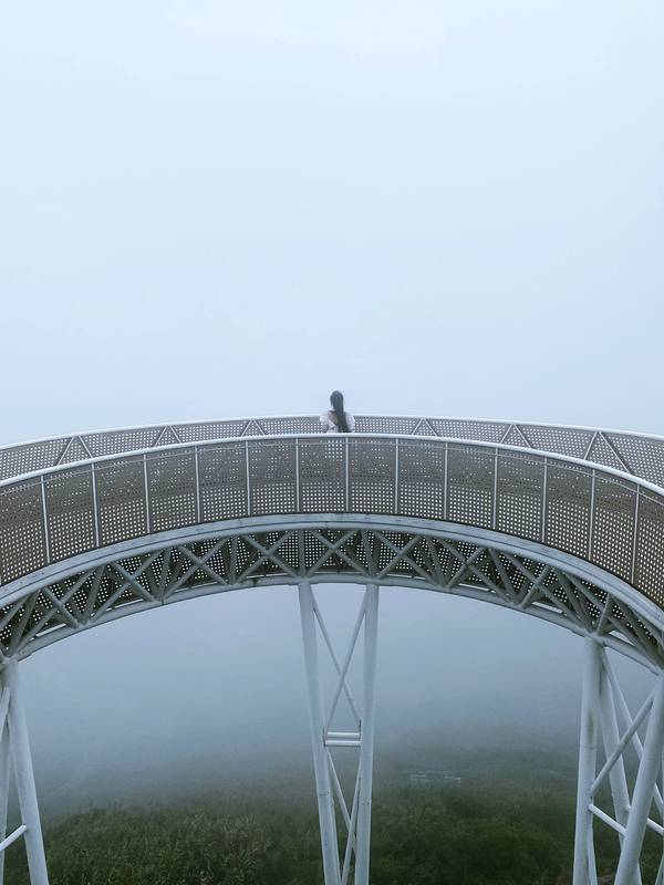 温岭的景区之间离的都挺近的,开车很方便,下一站就来到了最热门的地标之一:对戒观景平台,两个圆形的观景台可以270度俯瞰石塘镇的美,从空中看这两个观景台就如同两枚戒指,故取名“对戒”。 来之前各种美景美图也看了不少,可以说这里是此行最期待航拍的地方,景色一定很壮观,然而…… 到达景点之后,停完车需要走一条长长的步道上山至观景平台(连着第三个需要爬楼梯的景点了,来温岭旅游腿脚必须矫健) 爬到半山腰的时候感觉天气不大对劲了,这个雾气,怎么好像越来越大了??请记住这半山腰处的景色,这是那一天的天黑前最后的“遗照”……到达观景平台时,我们已被大雾笼罩,能见度为-100…… 我独自一人承包了观景台,但是那又怎么样… 留有遗憾,下次再来吧!景点名称:对戒观景平台 自驾停车:停车免费,快抵达时有几处路况比较窄,需要交替同行 门票消费:无门票,免费