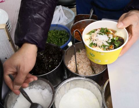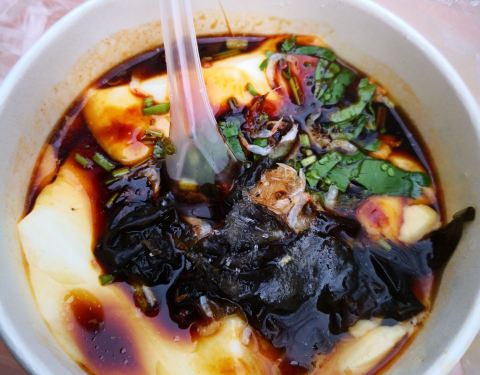 豆腐花清汤,加之老酱油,榨菜,虾米,紫菜,香菜等非常入味可口