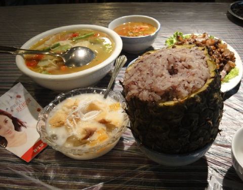 这家据说是很正宗的傣族风味。泡鲁达很特别,有椰浆,西米,和脆脆的东东和椰丝。很好喝的甜品。 烤五花肉是小块状的,肥而不腻,配上特质的酸甜酱汁 很好吃 菠萝紫米饭也不错