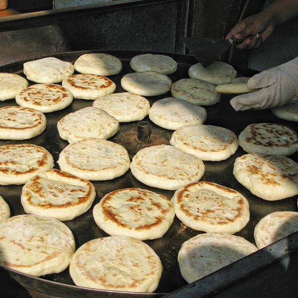 大圆锅上一次烙上几十个粑粑,烙好之后放到筲箕里面,以供大家抢购~ 当地人都是十几二十个打包购买,抢到之后又摊到筲箕上放会儿,再将其装走~