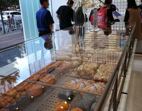 该面包店的面积很大,应该是占用了两到三个商铺后,将其改造装修后形成的;该面包店的排布非常好,正门朝里是收银台,中间部分便是各种面包的出售柜以及礼品盒的展览柜台,收银台右侧还专门设置了一个小休闲间,里面安放了几张桌椅,为一些愿意在此品尝美食的人专门提供了一个惬意的场所,个人感觉这样的设置非常人性化。此外,除了柜台之间的排布松散却又错落有致的情况下,面包店还在某些柜台上面下功夫,将其中一些柜台打造成环形的展示柜,再配合着各种灯光的照射,彰显了一种典雅的氛围,营造了一种浪漫的气氛,真的是将营销的理念打造到深邃的人性中去。