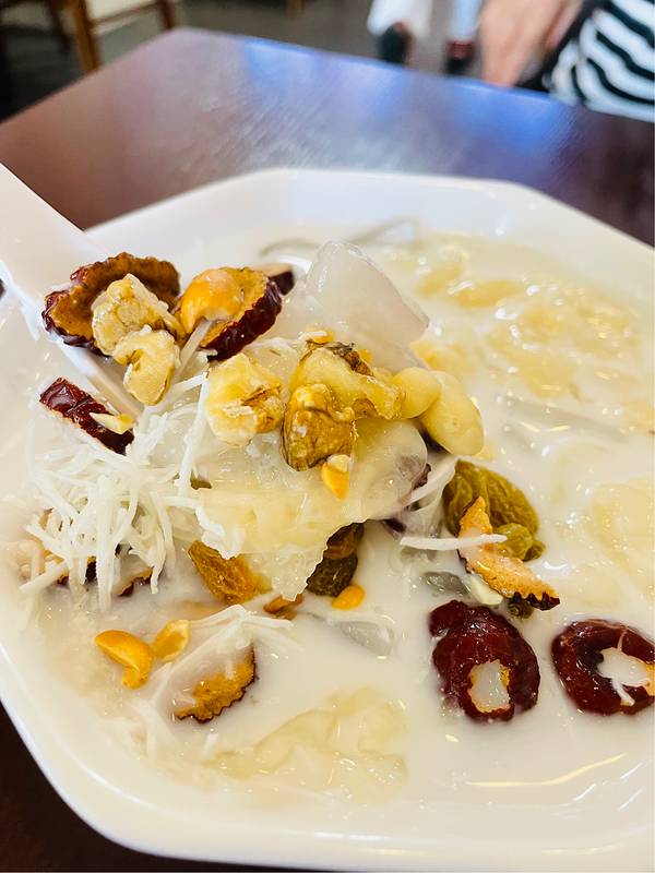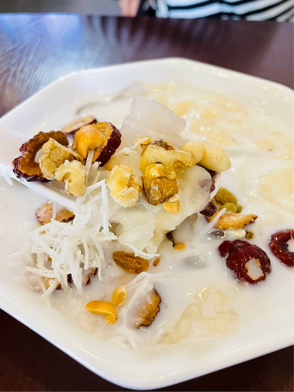 清补凉实际是夏天清热祛湿汤品的一种统称,流行于中国海南、广东、香港和澳门、广西等地区。不同地区有其独特的风味和食疗效果,可以是老火汤,也可以是糖水。 广东、香港和澳门等地,清补凉是夏天清热祛湿的老火汤。广西清补凉类似水果什锦冰。而海南清补凉结合了广东与广西所长,十来二十种材料,再添入海南产的新鲜椰肉、椰汁等,是一道食材丰富的糖水。没想到集各家所长的海南清补凉变得更有名气一点了! 👉店铺名:郑阿婆清补凉(第一市场店) 📍地址:海南省三亚市解放路98号 🕙营业时间:9:00-24:00 📌tips:过年期间不能用团购券。 🥥传统椰奶清补凉 15¥ 食材是相当丰富!枣片、椰丝、香蕉片、薏仁、花生碎粒、核桃碎粒、葡萄干、银耳,还有类似芋圆半透明的食材比较有弹性。以椰奶作为汤底,真的好吃!