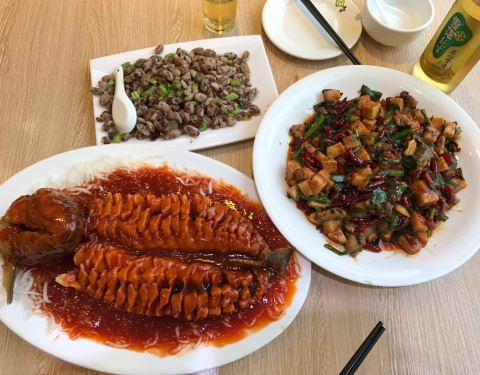 服务员很热情,松子桂鱼好吃!酥红豆也好吃!那个鸡… 好臭啊…