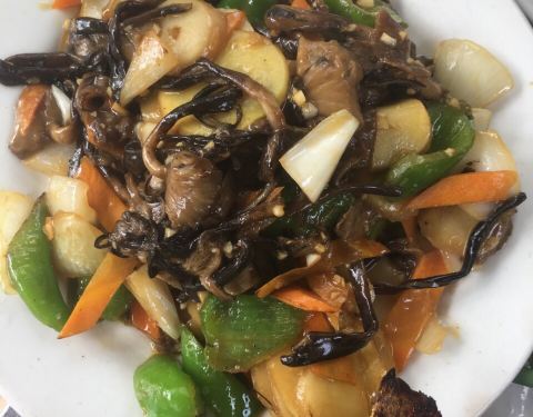 可心烤鱼离本溪水洞不远,小市一庄的斜对面, 位置非常明显。在一片水塘之上,自己钩鱼,称 重,然后有人帮你烤熟,虹鳟金鳟都是35元一 斤,味道很好。鱼头鱼尾做成鱼汤,相当新鲜 我们还点了许多有特色的山野菜,最赞的是炸河 虾,非常新鲜,野菜我们是拼盘煮懃沾豆辧酱 吃,东北的小土豆也是非常好吃,建议点这个。 因为是东北,感觉榛蘑不能错过,所以又点了榛 蘑士豆片,这在大天津是吃不到的。在茅草涼亭 下用餐,与大自然充分融合,孩子边吃边玩,是 个好地方。