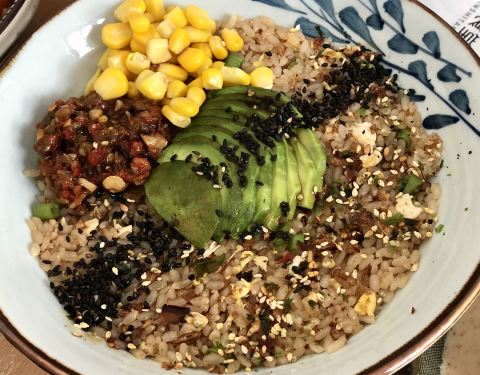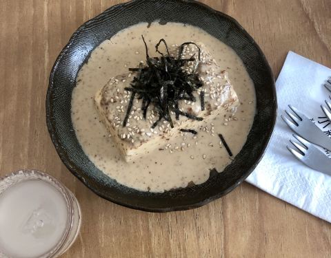 这个日系小食堂开在靠近湖边的地方,有阳光的天气简直不要太美,随便拍拍都是大片,店内的装修也很日系温馨,很好拍照!! 店内还有两只可爱的狗狗~公狗叫曲奇母狗叫肉松,坐在店内吃东西的时候两只小可爱时而打闹追赶真的太太太可爱了~ 我们四个人点了一个香肠芝士焗饭,芝士非常多咸香的饭配上咸甜的芝士,我可以!还点了牛油果拌饭,胡麻豆腐,胡麻豆腐的蘸料是烘培芝麻,豆腐很嫩,男朋友赞不绝口,看着他一口一口的吃完了哈哈哈哈我们点的彩虹水果沙拉,是我在店里吃过最新鲜的水果啦,樱桃超大一颗!还点了一份小米酒,甜甜的四个人一下就喝完了,意犹未尽啊!下次有时间还会再来滴!