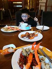 毕竟价格摆在那里,肯定不能和三百一位的自助餐比,不过一样有长脚蟹、海鲜、现煎的牛排、鸡翅、现煮都的面点,还有各类甜点,小朋友也是很满意了。去的时候是小龙虾季,餐厅也有提供香辣小龙虾,不过千岛湖人都很会吃辣,小龙虾对我来说有点太辣了。