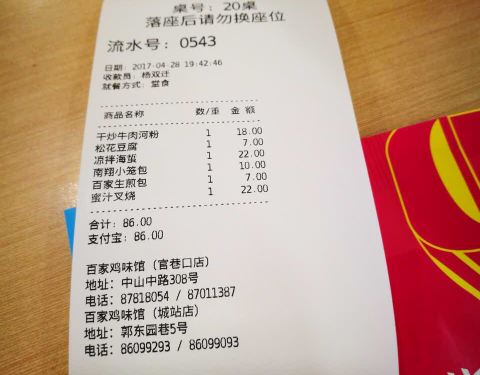 今天在杭州吃的是一家本地小伙伴们强烈推荐的老店,招牌是鸡,所以今天跟我们一起吃鸡,一桌子花了80左右,你们觉得贵吗?我觉得还可以哦!招牌百家鸡【口味】配有蘸料,单吃鸡肉味道有点淡,蘸着酱料是真的好吃...今天在杭州吃的是一家本地小伙伴们强烈推荐的老店,招牌是鸡,所以今天跟我们一起吃鸡,一桌子花了80左右,你们觉得贵吗?我觉得还可以哦!招牌百家鸡【口味】配有蘸料,单吃鸡肉味道有点淡,蘸着酱料是真的好吃!【口感】鸡肉比较嫩,不是很爱鸡皮的口感。【价格】11元(小盘)【推荐】★★★★☆蜜汁叉烧【口味】偏甜口,一点都不腻,配有一些花生米,味道很好。【口感】叉烧周围有点脆,中间是嫩嫩的,口感也很好。【价格】22元一份【推荐】★★★★★咖喱肉角【口味】咖喱的味道适中,肉馅里有蔬菜也不腻,很好吃。【口感】油炸过的,外皮很脆;肉馅也很足,好吃。【价格】7元一份【推荐】★★★★★叉烧薄饼【口味】甜咸口,味道不是很浓重,有些许叉烧丁。【口感】很软,有点黏。【价格】7元一份【推荐】★★★☆☆凉拌笋干【口味】没有太多调味料的味道,笋本身的味道很香,吃起来很爽口。【口感】凉菜系列,略脆。【价格】7元一份【推荐】★★★★☆ 茄汁猪扒饭【口味】茄汁的味道很好,猪扒蘸着茄汁吃很不错。配菜味道也可以。【口感】猪扒切条状,外酥里嫩;米饭不干。【价格】16元一份【推荐】★★★★★鸡粥【口味】咸口,不单单是一碗白粥,里面有肉末还有秘制调味料,口味很丰富。【口感】肉末是炸出来的,吃起来脆脆的,口感特别棒。【价格】3元一碗【推荐】★★★★★鸡爪【口味】单吃鸡爪并没有什么味道,蘸着之前百家鸡的酱料吃还行。 【口感】感觉一般般,没有什么特点。【价格】2元一个【推荐】★★☆☆☆【环境】快餐店形式,比较干净【服务】还可以【地点】(杭州)中山中路308号近开元路【tips】使用口碑8.8折券可优惠
