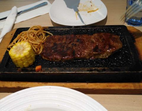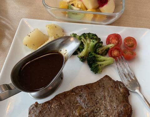 - 提拉米苏和抹茶雪域卖相和口感均可得满分。牛排味道不错,煎得很嫩;水果色拉量太少,水果比较廉价