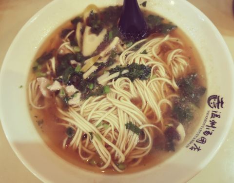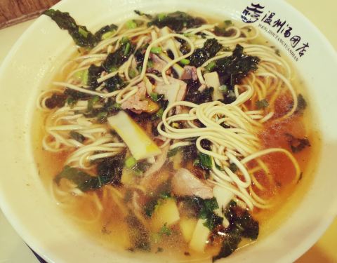[环境]温州汤团店,“屹立”于新华路14号。在这条老字号餐饮店荟萃的新华路,已有20年的店龄,经久不衰的生意,精湛的厨艺技术,过硬的实力,极高的性价比,打败网红店无数,独占鳌头,成为老店中的“网红”,大名鼎鼎却也依然从容低调。老店就像一坛黄酒,历经岁月流逝,历久弥新,越陈越香。 24小时营业的温州汤团店,夜深人静,雨点纷飞,倾盆大雨将至,它如回家路上一盏明亮的灯,也是深夜食堂,提醒你不妨吃碗面,避避雨吧。 店内环境简单整洁,曾有细微修缮,墙上贴有“请勿浪费”诸如此类文艺标语,也设有放置手机的塑料架,人性化现代化服务,感谢依然保留了老字号的原汁原貌,复古情怀在这里四处安放。 [服务]店里的几个阿姨都是许许多多年的老员工了,她们的脸似乎印刻在周围居民脑海里了。菜品端出厨房,她们就会大声呼喊菜名,直到顾客摆摆手,端到顾客桌上。这种“呐喊”式的上菜服务多年延续,习惯于这种近乎亲切的真实。这或许也是老店的“本色”吧。 |青菜笋干面^一碗素面,13元。满满一大碗新鲜出炉,热气腾腾飘着热气,猪油香味扑鼻,青菜切的薄薄的,笋干切的细细的,且放足鲜嫩的笋尖,面条细长且柔韧,笋尖、青菜、猪油搭配熬制,一碗汤面的精髓在于汤底,一种跨越20年,千锤百炼,不改初心的本土味道。 雨夜吃起这碗面,20年往事,点滴如碎片,在脑海浮现,在眼前闪烁,又如蝴蝶般翩翩而过。20年前,10年前,5年前,1年前,我都在温州汤团店吃面,而故人和旧事早已消逝而去,无从追忆。 回忆的转角处,只留下一碗青菜笋干面,温州汤团店里思流年。